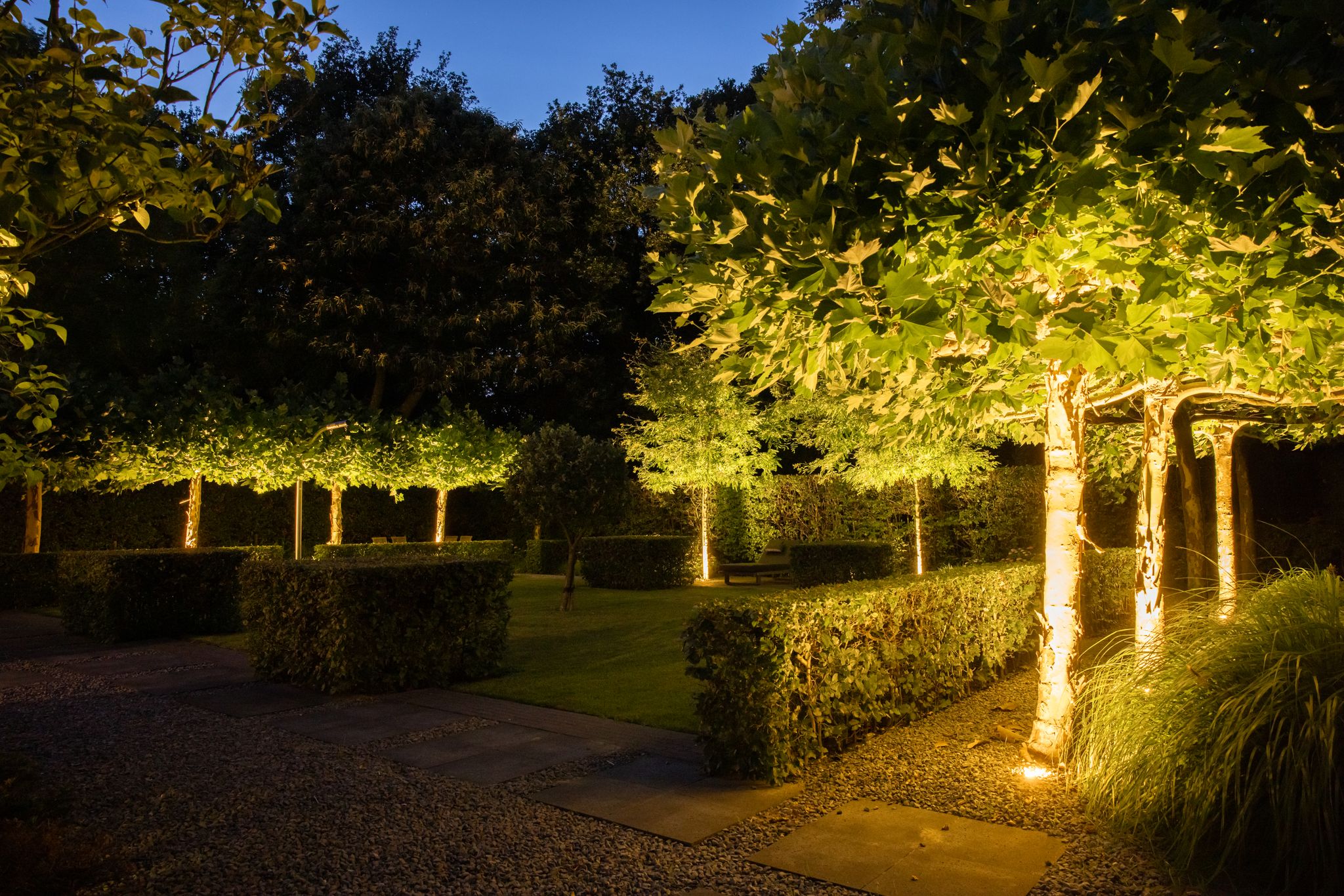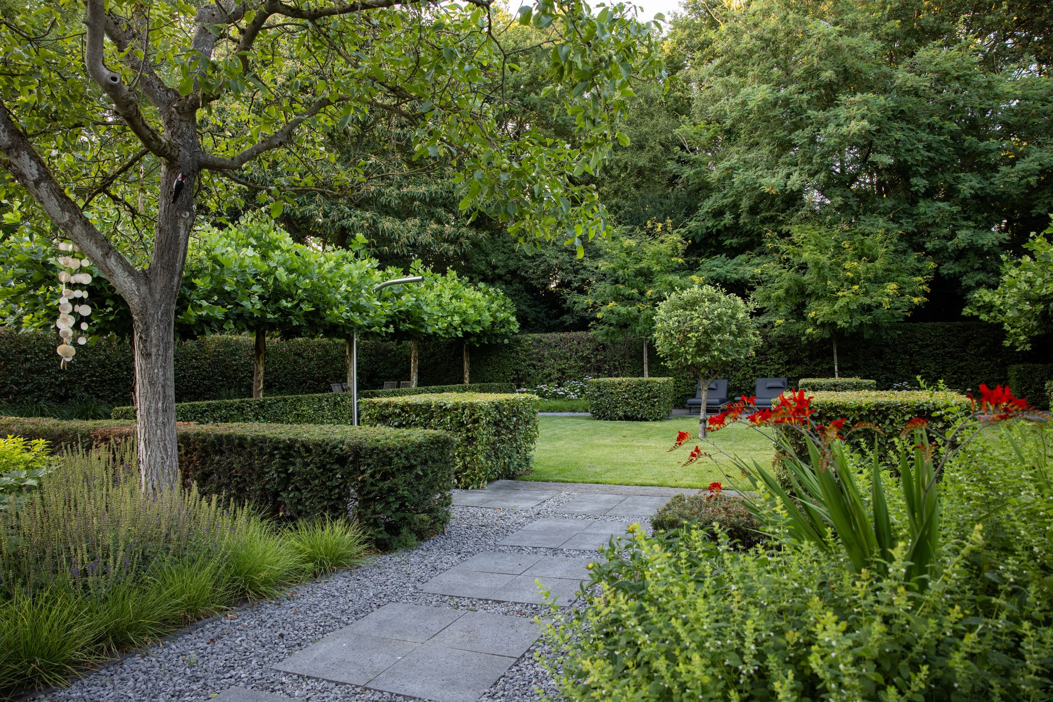 De borders zijn beplant met siergrassen, vaste planten en diverse taxus- en beukenhagen, waardoor een strak en groen geheel ontstaat. Sfeervolle tuinverlichting bij de bomen en langs de oprit maakt de tuin ook in de avond uitnodigend.