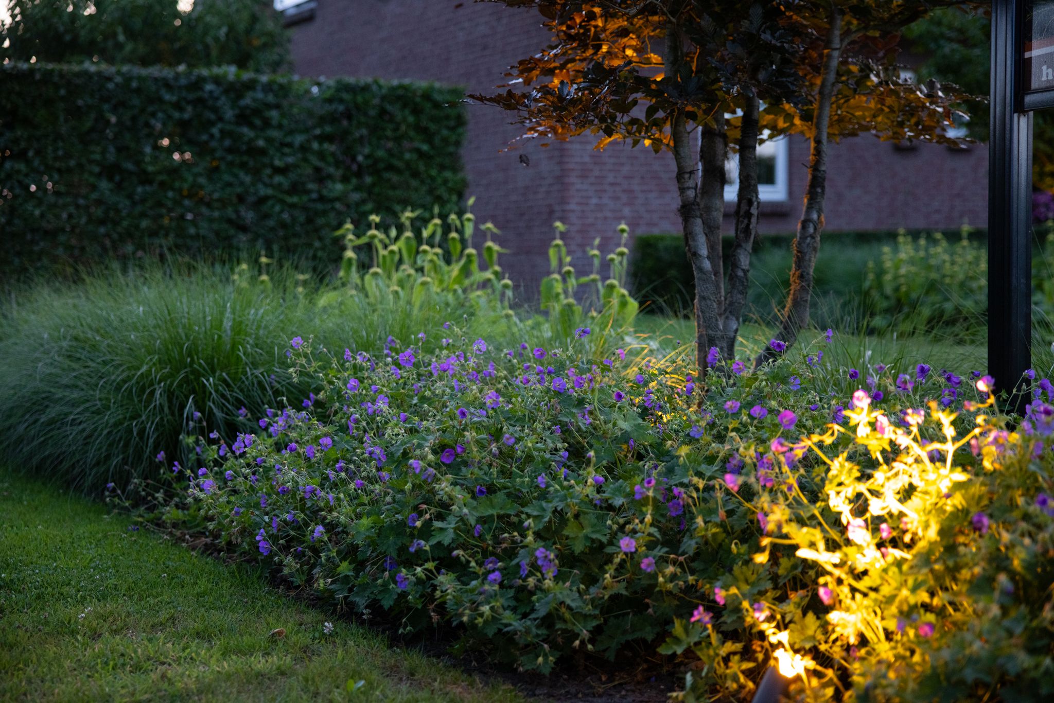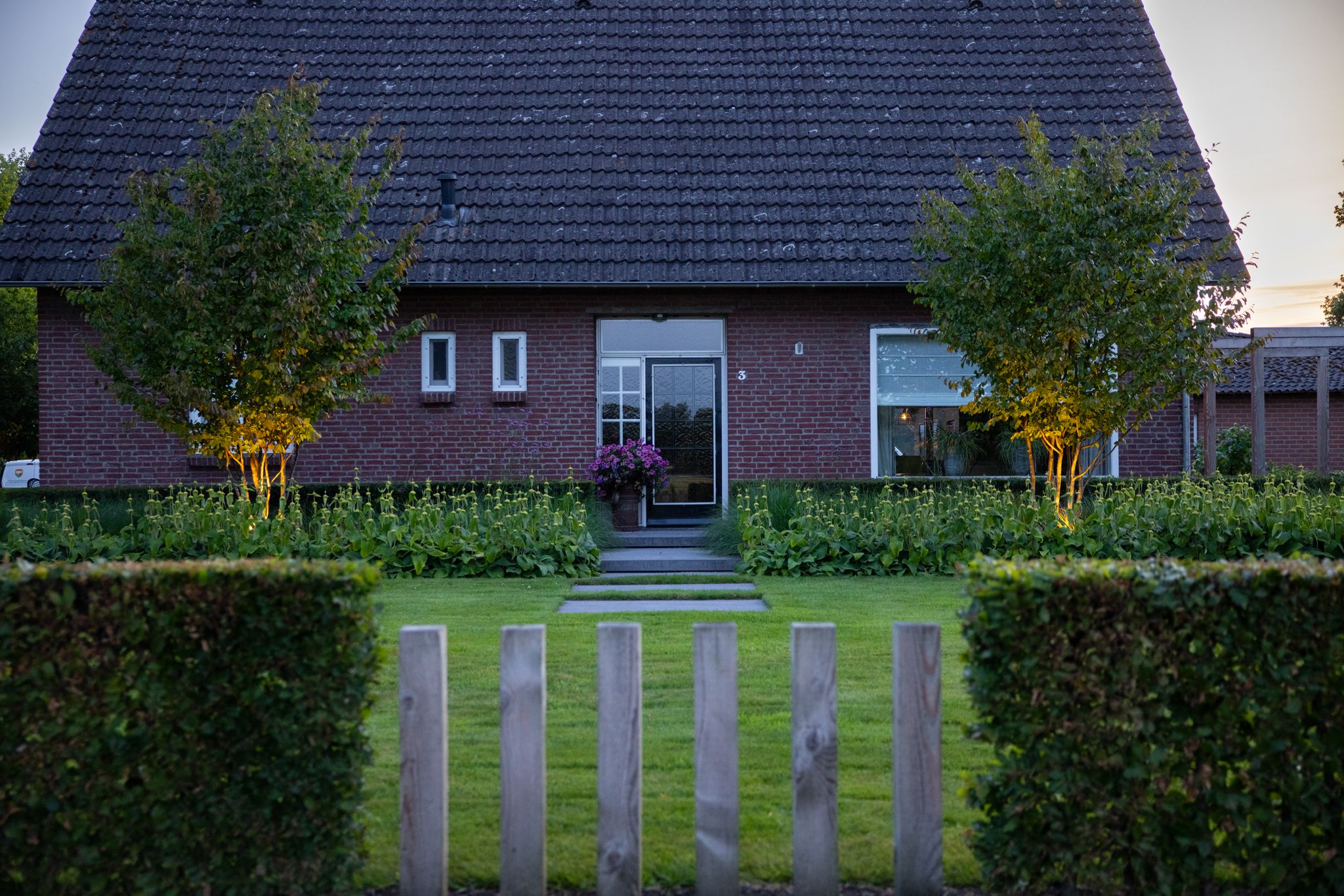De tuin is verder voorzien van sfeervolle verlichting bij de bomen en een volledig beregeningssysteem, waardoor het een onderhoudsvriendelijk en uitnodigend geheel vormt.
